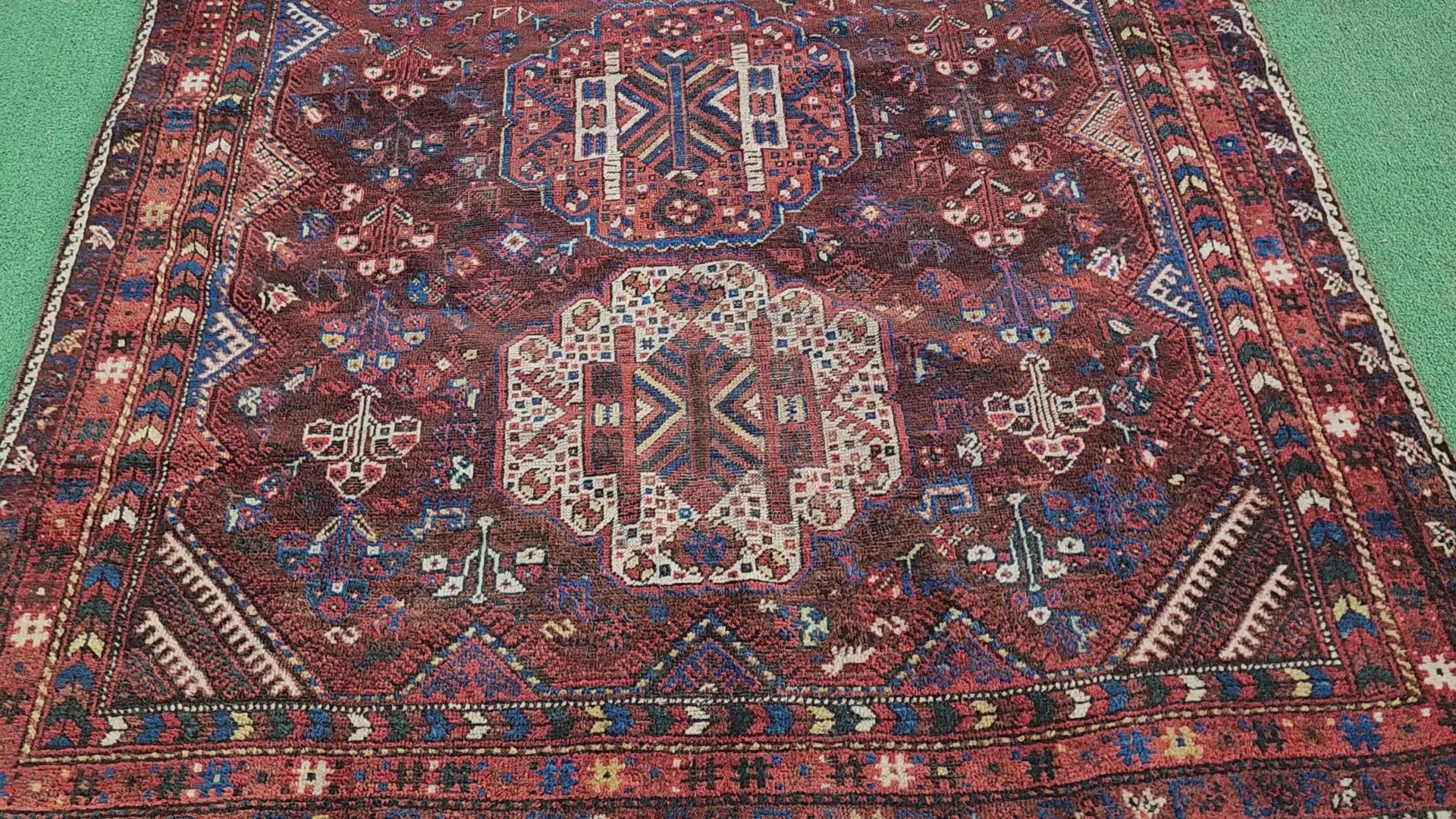 Alfombra persa antigua Shiraz de 1,55 m x 1,98 m