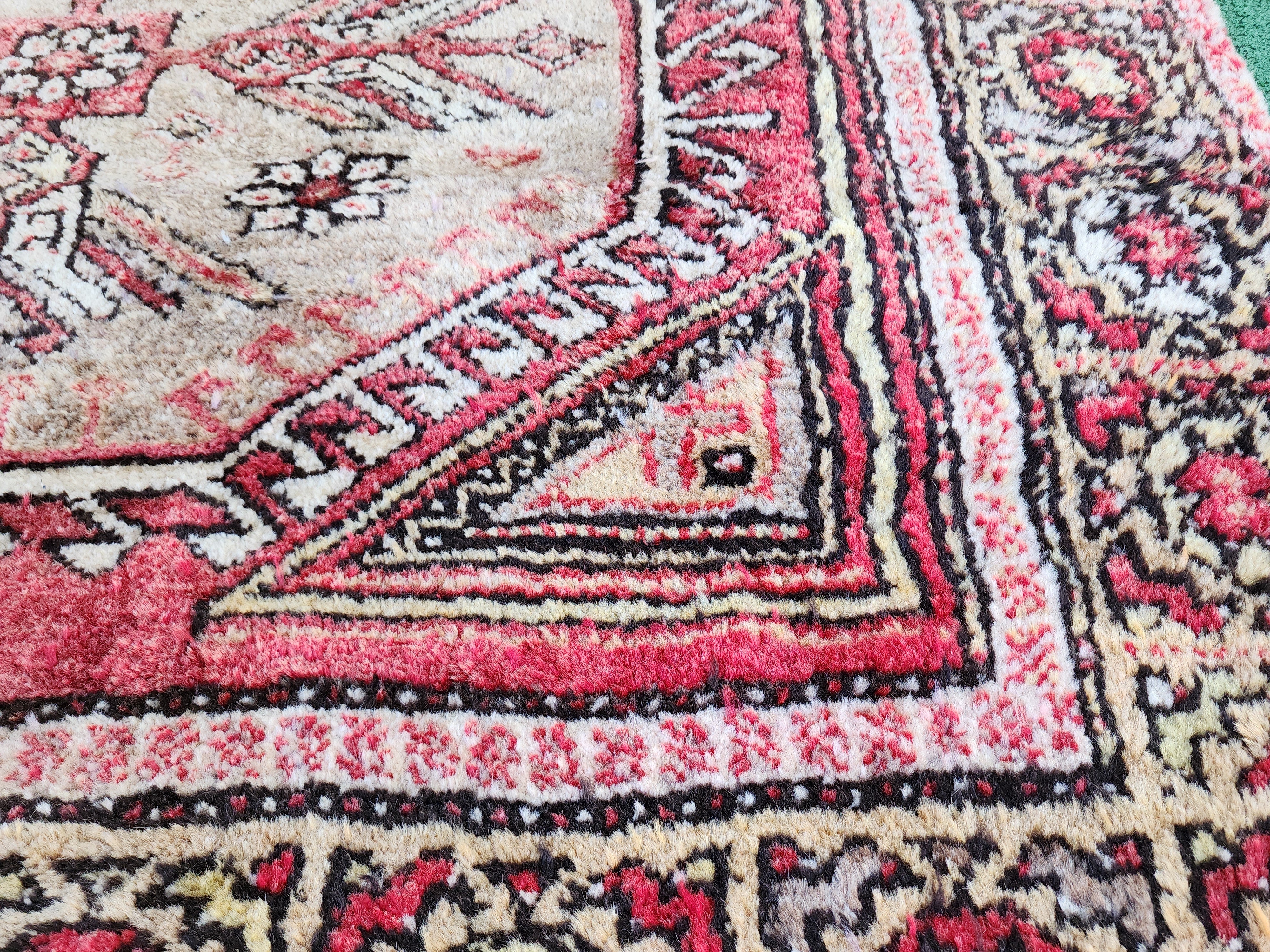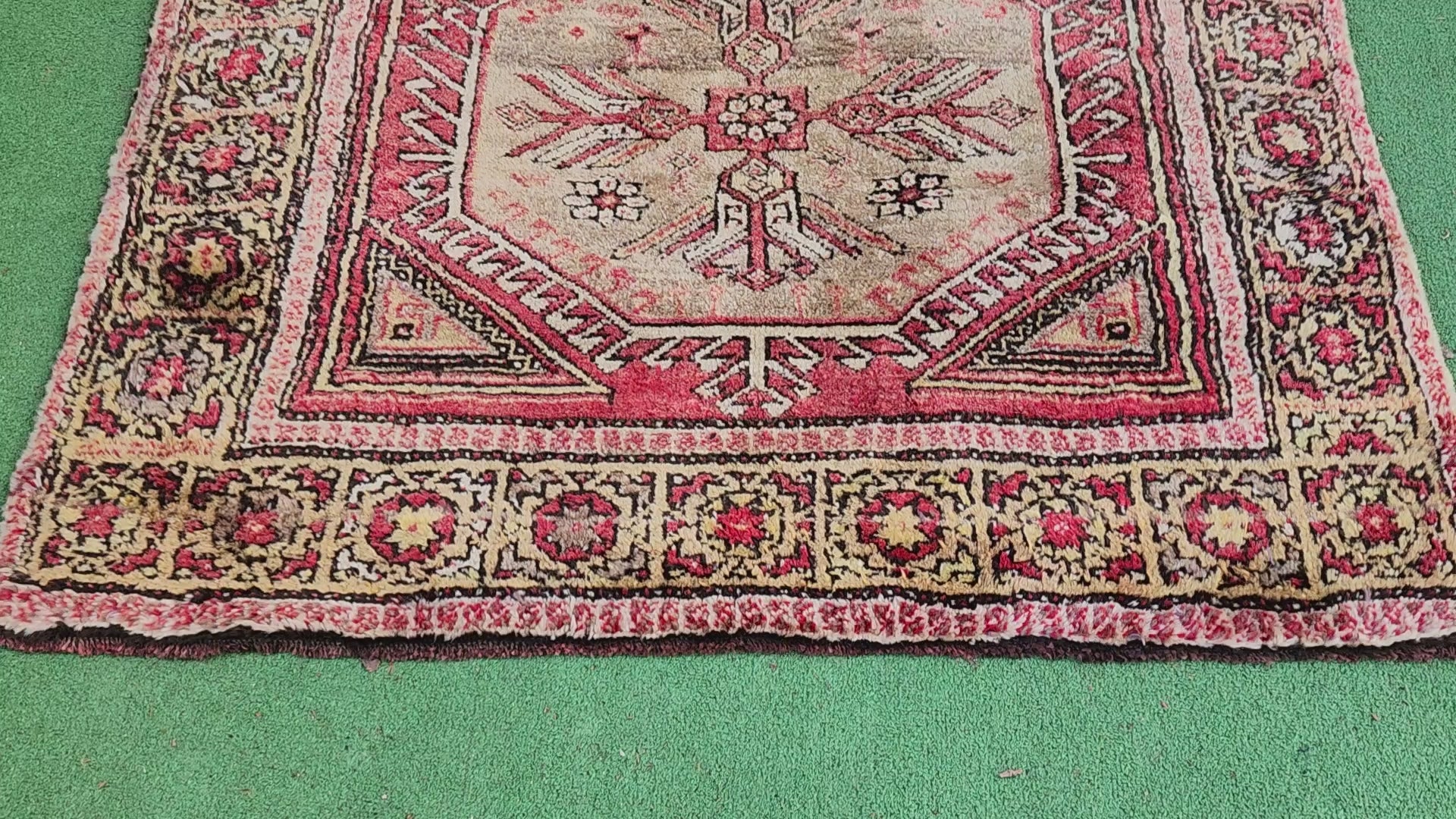 Alfombra antigua turca Tulu, 1,96 m x 1,36 m, alfombra con medallón floral en marrón rojizo y crema, hecha a mano con lana natural