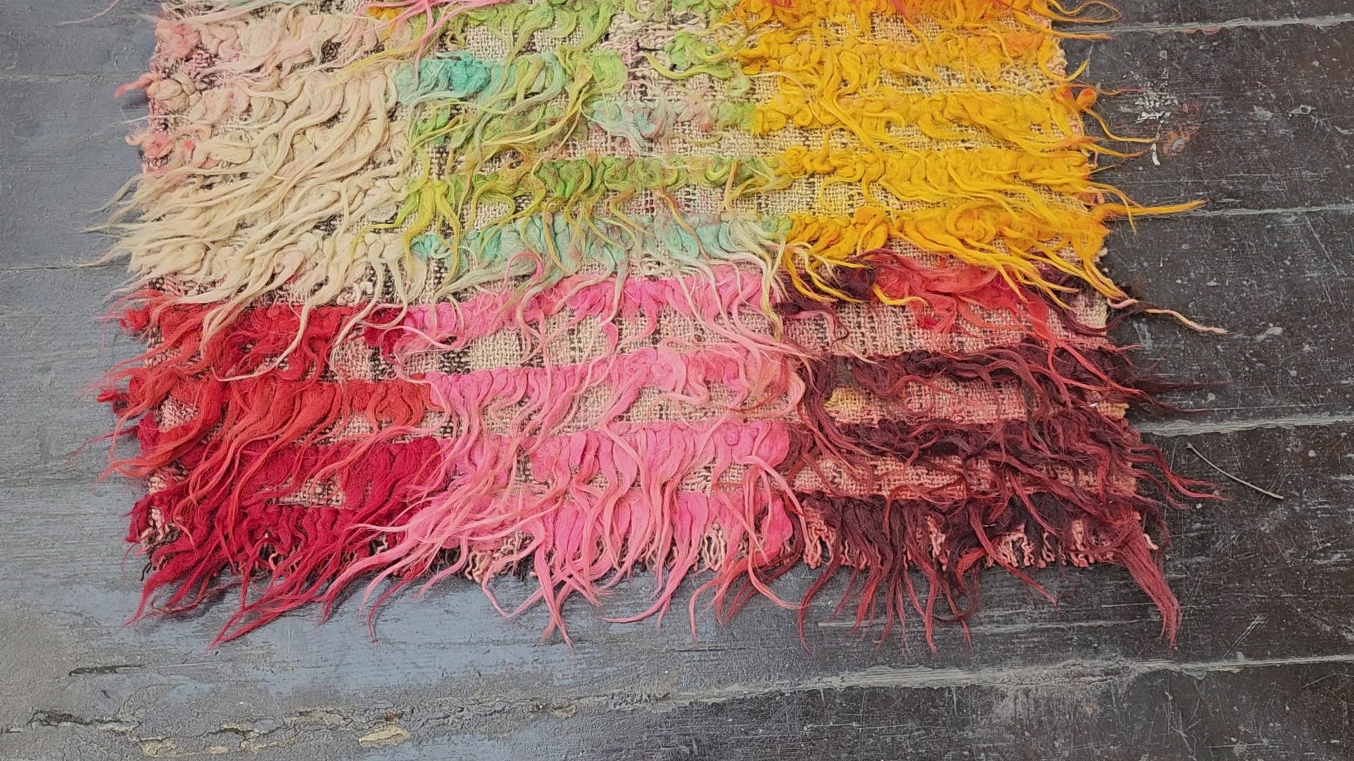 Esta llamativa alfombra Filikli Tulu en rojo, amarillo y rosa mide 105 cm x 62 cm y es un kilim de tejido plano con mechones de lana, hilo de pelo de cabra o tiras finas de tela entretejidas en la base del kilim, utilizando el nudo turco para crear la distintiva textura "peluda" o "con mechones" y la apariencia exclusiva de estas alfombras. Originalmente tejida en Anatolia central, Turquía, por tejedores tribales hace hasta 60 años.