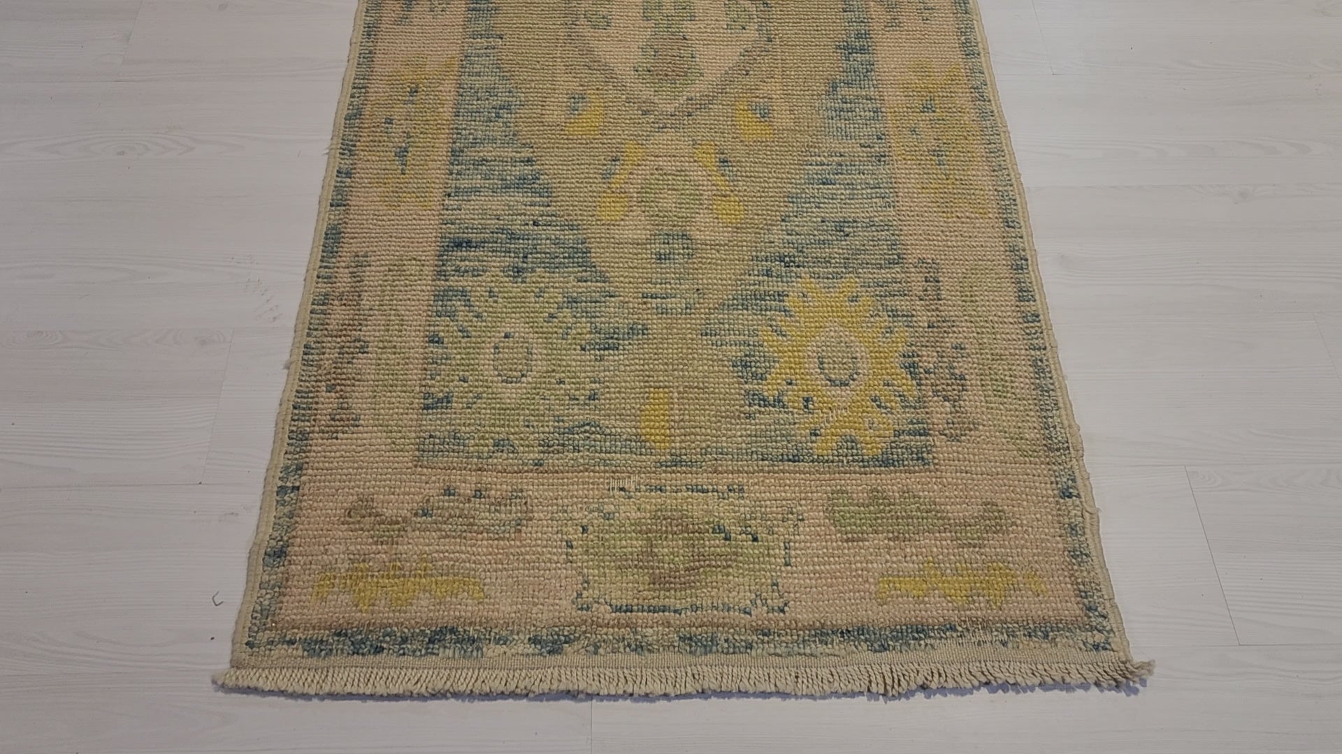 This beautiful runner rug is a traditional Ushak piece, handwoven in the 1960s by village women in the Ushak region. It's made from all-natural wool and dyed with plant-based colors. The rug features a lovely palette of pastel tones and is ready for use, complete with beautiful Ottoman-era motifs.