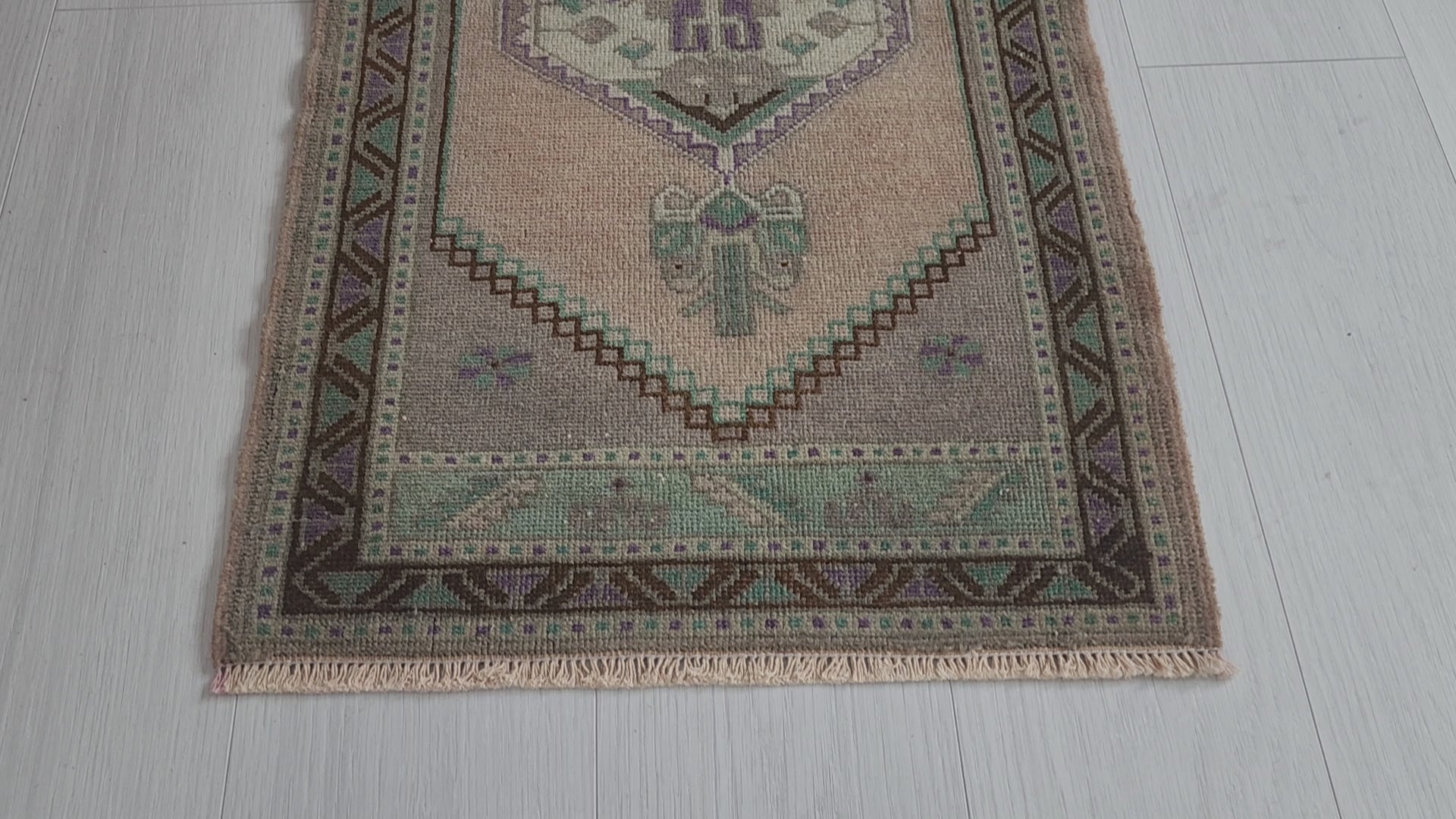 Alfombra turca pequeña vintage, 3 pies 5 pulgadas x 1 pie 9 pulgadas, alfombra de estilo antiguo desgastada y descolorida en rosa, verde/gris y beige