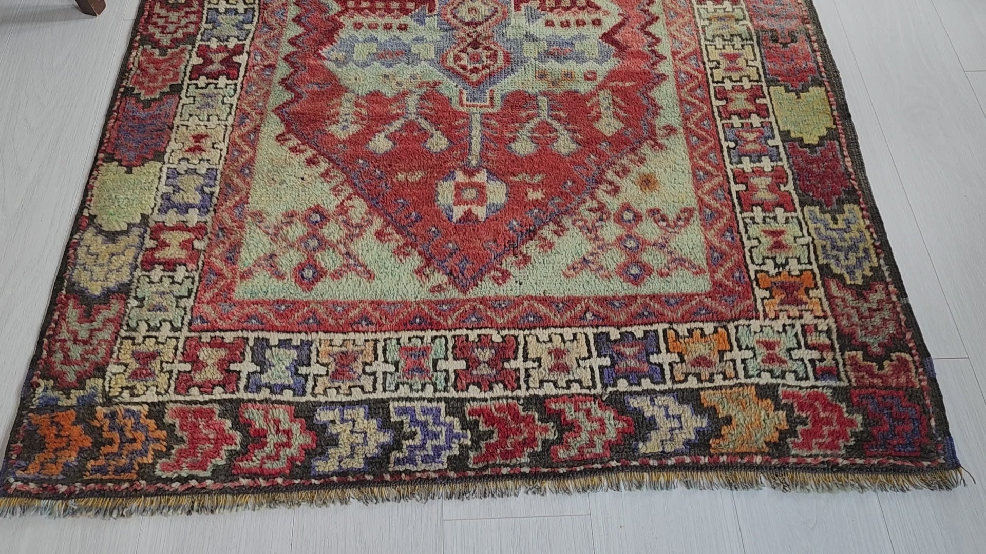 This is a striking example of a Turkish village rug, most likely originating from the Konya region in Central Anatolia. It possesses a powerful and rustic aesthetic, characterized by its bold geometric patterns, a rich, time-softened color palette, and symbolic tribal motifs.