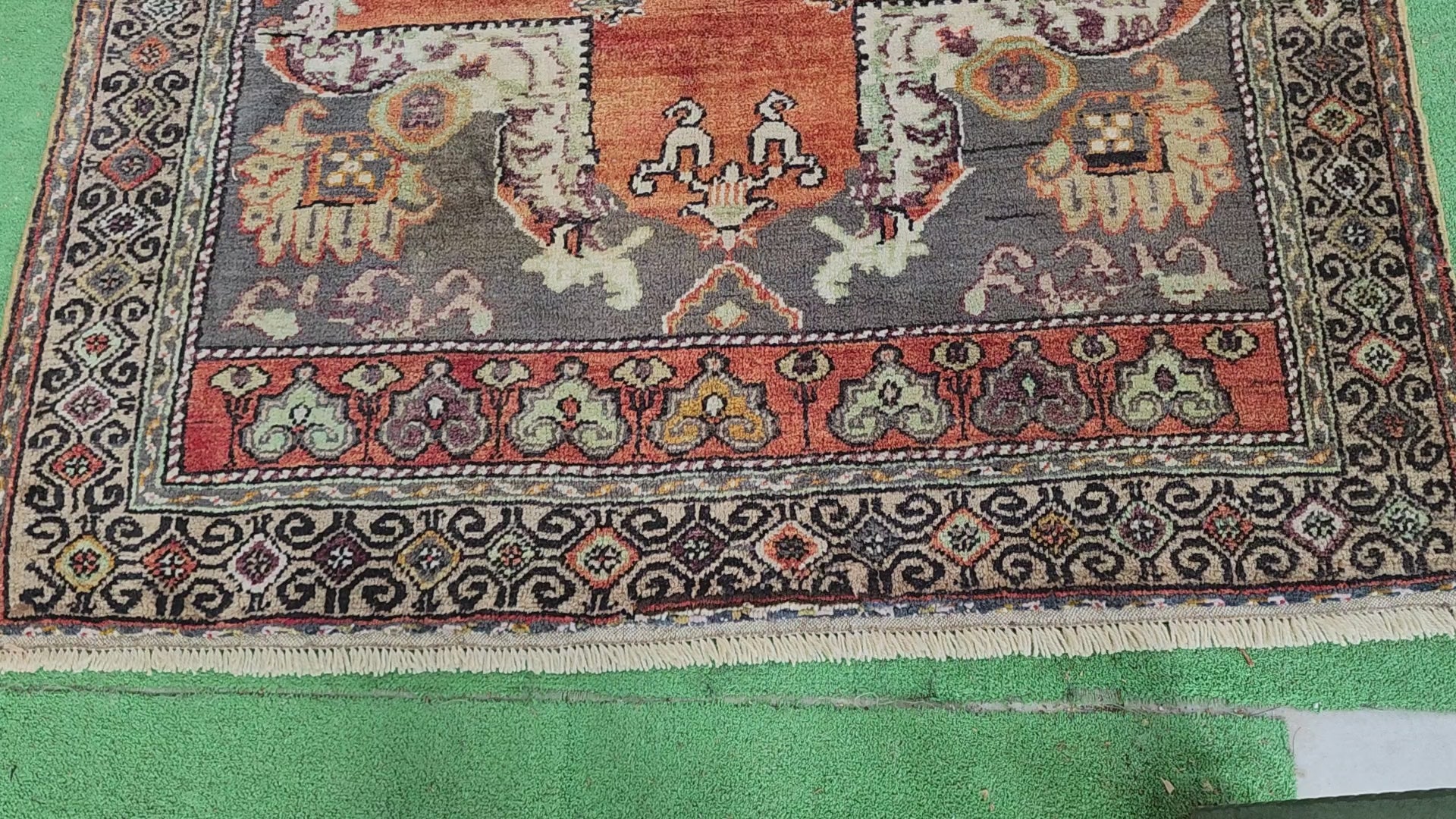 This carpet, woven in the Nigde city in southern Anatolia, has soft shades of orange and was woven using completely natural dyes and sheep wool. It is one of the carpets that can be a very good example of the 1950s.