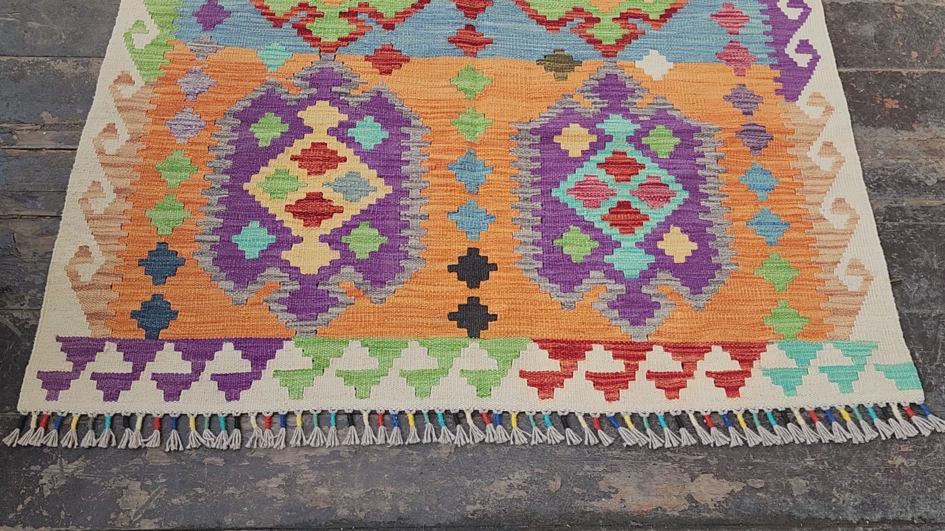 Afghan Kilim Rug, 3'8''x5'7'' Orange Blue and Red Kilim Rug, Turkish Southwest Aztec Boho Rustic Handmade Natural Wool Persian Rug