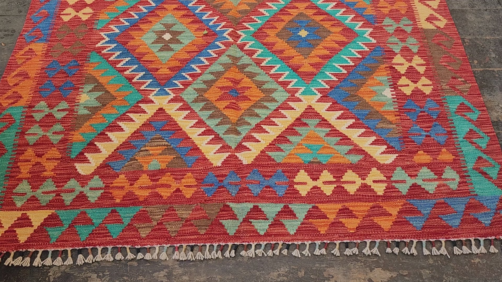 Afghan Kilim Rug, ''5''x6'7'' Orange Blue and Green Kilim Rug,
