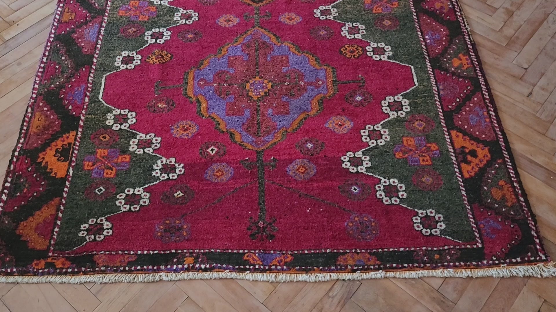 It was woven in the early 1910s in the town of Konya Cihanbeyli in central Anatolia by the Kurdish nomadic people, using pure wool and natural root dyeing. It is in very good condition and excellent wool has been used.