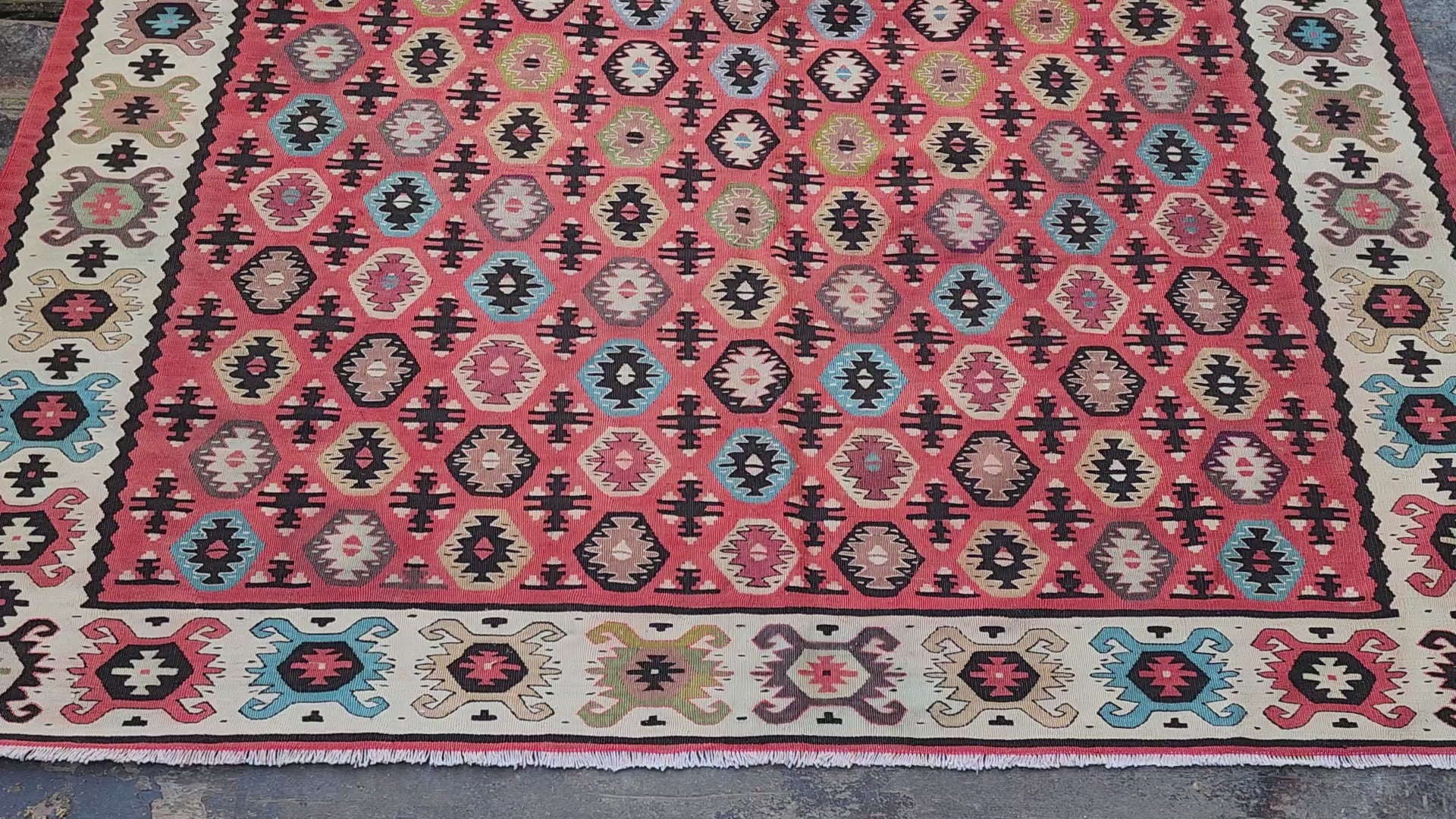 This is a 100% Handmade, Vintage Wool Flat-weave Kilim Rug, made by Tribal Weavers up to 100 years ago. We source all of our rugs from the Villages and Towns in which they were originally made, selecting only those of the highest quality of original materials and workmanship. This beautiful Kilim rug is in original condition. Although the original weaver may be long gone, the fruits of his/her labour will certainly continue to bring pleasure to generations to come.