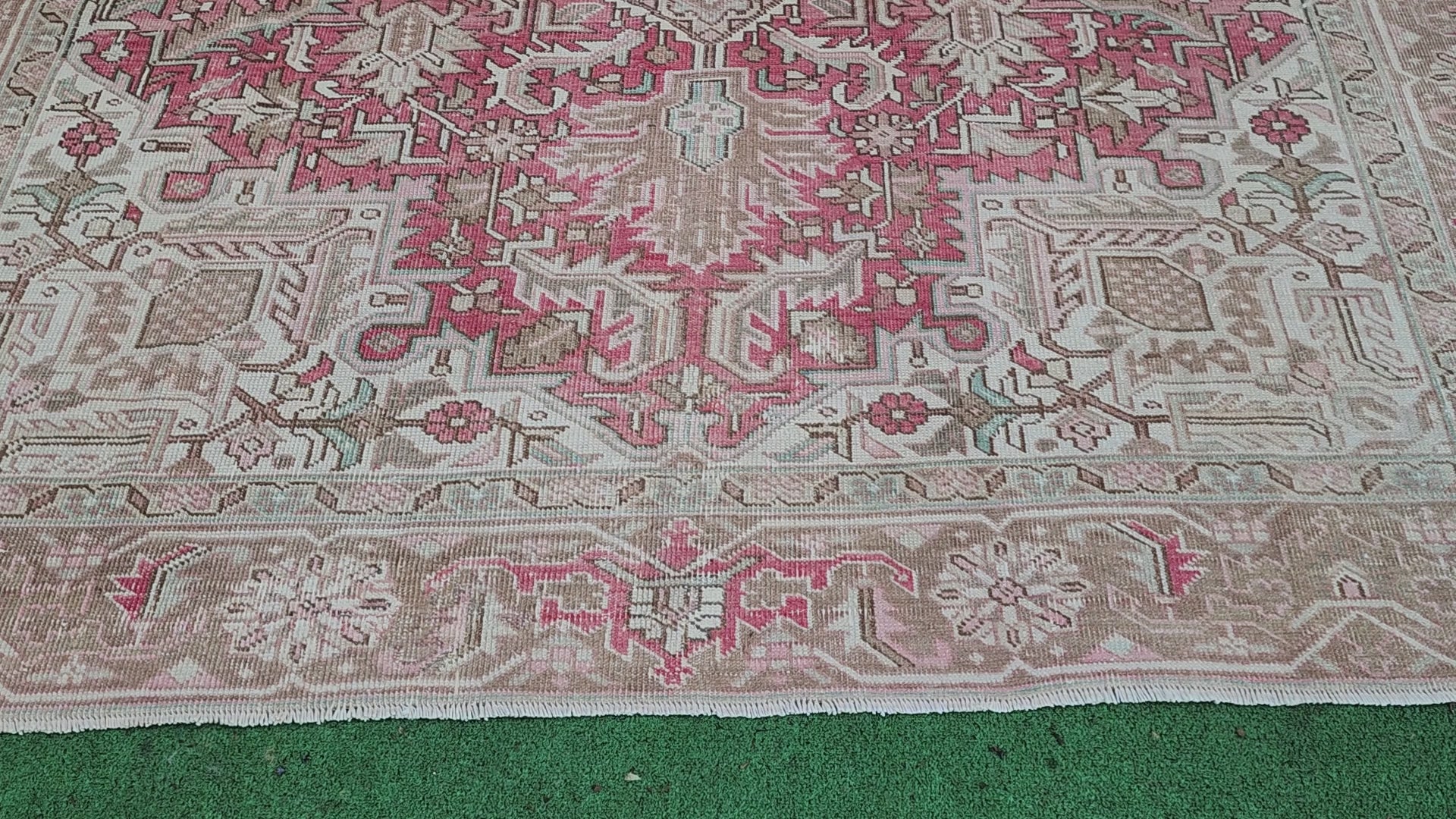 The rug features a prominent central medallion, a hallmark of Heriz designs. This medallion is often angular or geometric, as seen in the image. The design elements surrounding the medallion are highly geometric and stylized, another characteristic of Heriz rugs. You see the use of angular lines and shapes rather than flowing, curvilinear designs common in some other Persian rug styles. The colors visible in the image, such as the various shades of red/pink, beige/brown, and hints of blue/green are consistent with typical Heriz palettes. Heriz rugs often utilize rich, earthy tones. The combination of the bold design, geometric patterns, and characteristic color palette strongly suggests a Heriz origin.