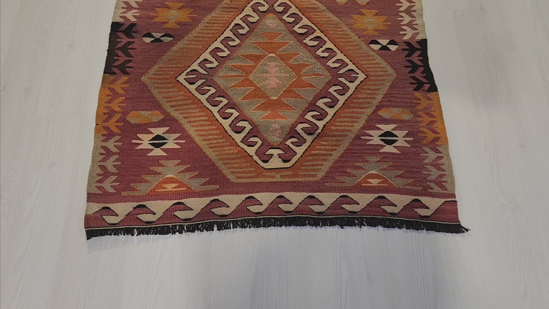 Traditional Design Kilim Hallway Runner Rug in lovely, natural shades of purple, orrange and green. Vintage Flat-Weave Kilim Natural Wool Rug, made in Denizli Region of Central Anatolia, Turkey by Tribal Weavers up to 60 years ago. This rug may be reversed but we do recommend it would benefit from the use of a non-slip underlay to prevent movement on smooth surfaces.