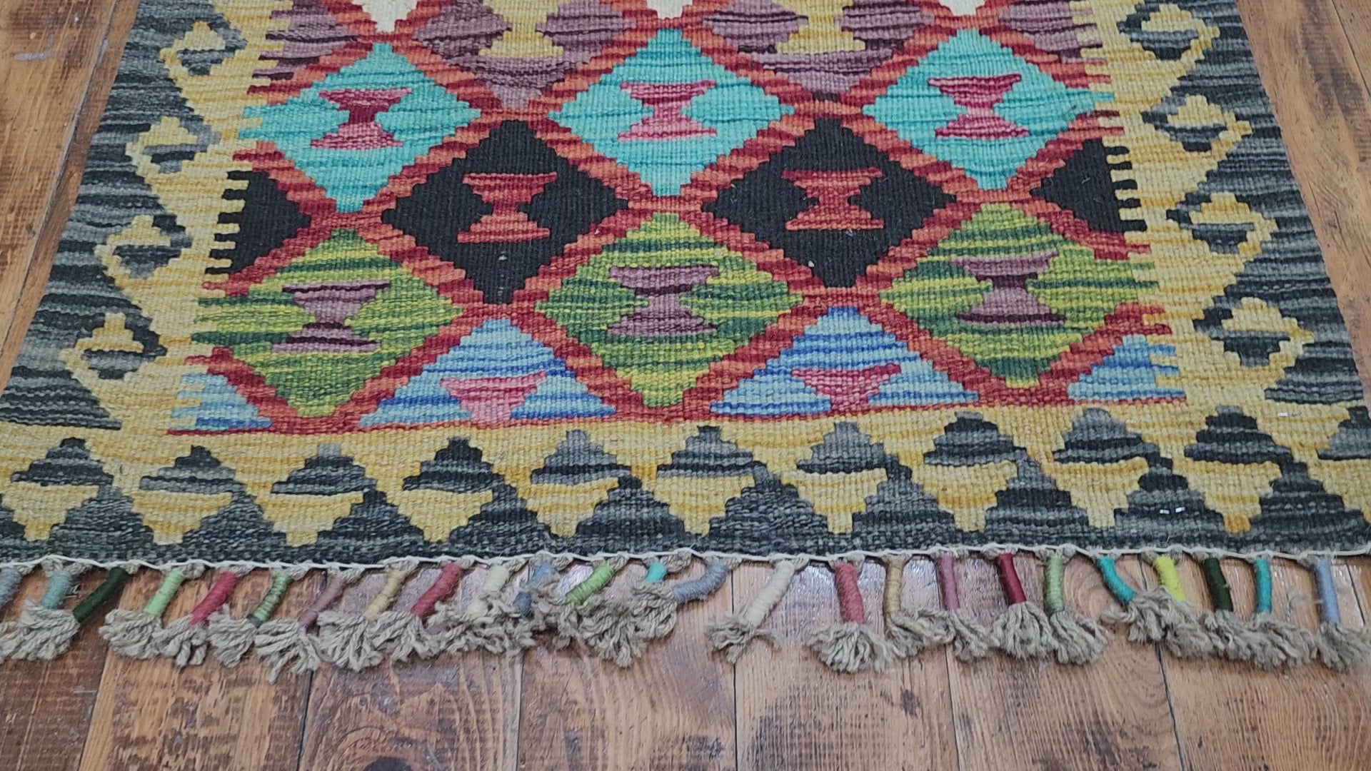 A kilim runner is a long, narrow rug that is typically flat-woven, meaning it doesn't have a pile like a traditional rug. Kilims are known for their vibrant colors, intricate patterns, and durability. Kilim runners are perfect for adding a touch of style and warmth to hallways, stairs, kitchens, and other long, narrow spaces.