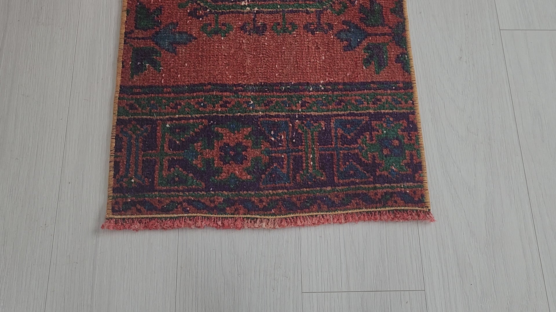 Small Turkish Rug, 4 ft 4 in x 1 ft 7 in, Apricot Orange and Teal Green / Grey Vintage Faded Distressed Door Mat