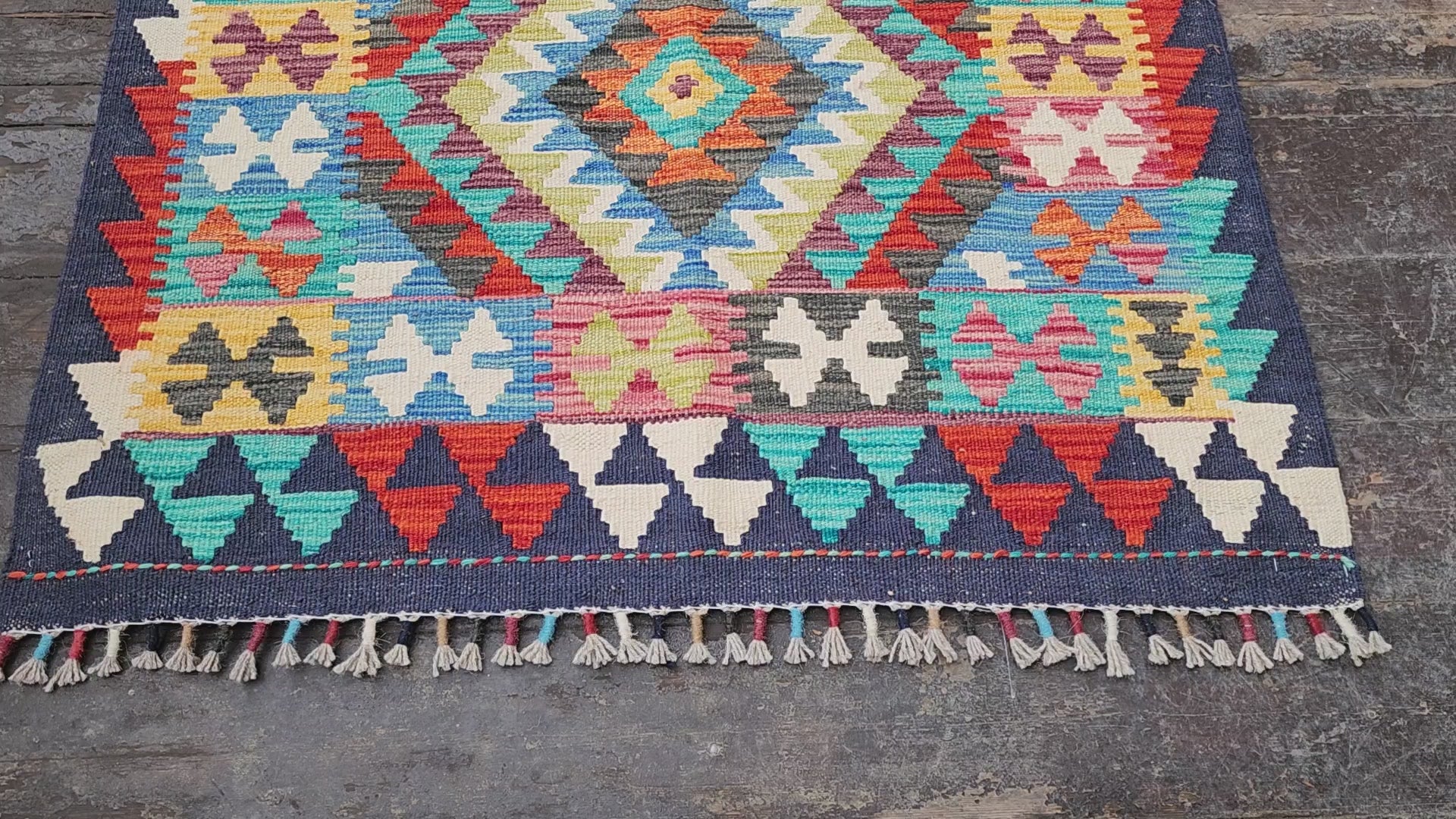 This Kilim has been made of locally sourced sheep wool, coloured with vegetable dyes using a unique technique to produce the softly variegated, muted colors which compliment contemporary home decor trends. This rug is the perfect way to add a traditional piece of the past to the present-day home.