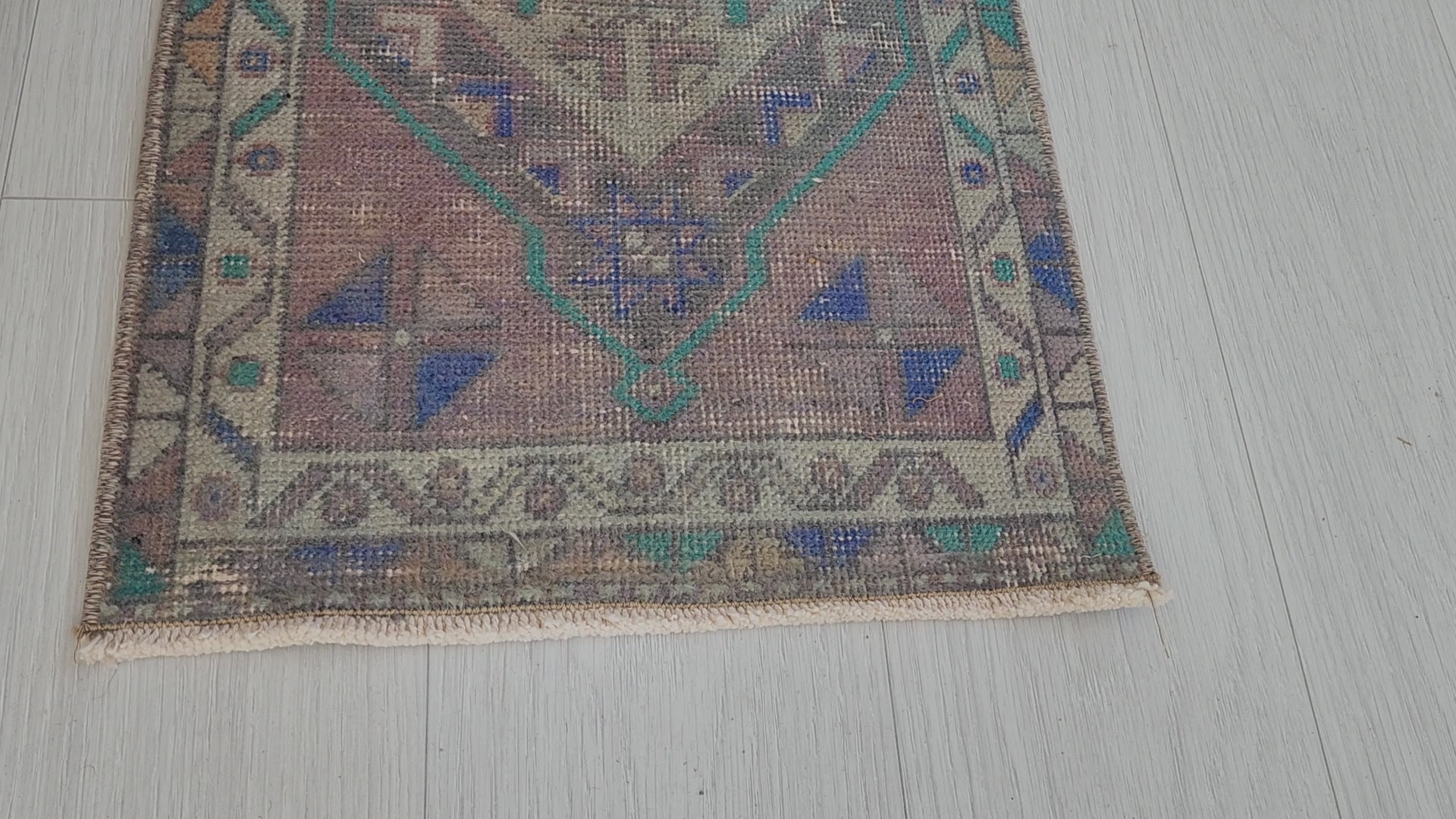 Measuring 3 ft 2 in x 1 ft 5 in (96.5 cms x 43.1 cms) this is a lovely, hand-knotted small mat, whiche probably began its' life as a floor / sleeping pillow or storage bag for everyday use in village homes or in tents on nomadic travels. This mat was originally woven in Central Anatolia, Turkey up to 60 years ago and is perfect for use in entry ways, in front of the sink in the kitchen or beside a bed etc. Softly colored, This particular rug is an Oushak Style / Pastel Wash Vintage Turkish Rug which has been “Color Reformed” and / or "Antique Washed" and the pile reduced to produce the faded / distressed “Vintage-Look” so popular at this time. These rugs combine a contemporary color palette with vintage design appeal