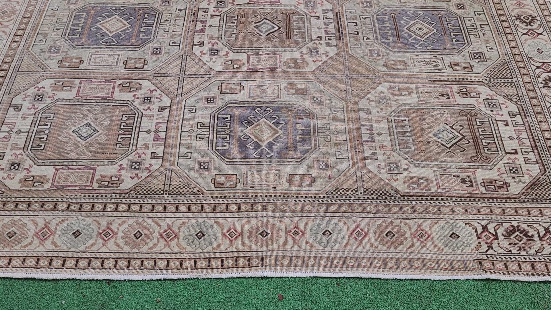 Pastel Room Decor Vintage Turkish Oushak Floor Rug in Soft Brown and Beige measuring 9 ft 7 in x 6 ft 7 in (291 cm x 200 cm). This Handmade Rug originated from Central Anatolia, Turkey and was woven mid-20th Century according to traditional designs and techniques passed from generation to generation of home-based village weavers. Locally sourced sheep wool was hand-spun and then dyed with vegetable / organic dyes specific to the area. These rugs were traditionally quite bold and strongly colored and had quite thick, long pile/nap. However, such strongly colored and heavily piled rugs are not as compatible with contemporary home decor as they were with life in the Villages in Turkey, so the colors in this rug have been softened and faded in natural sun light and the pile reduced / shaved to produce the “Vintage Distressed” / “Pastel Overdyed” look so in keeping with modern home decoration trends. These rugs combine a Pale Muted Contemporary Color Palette with Vintage Antique Look Design appeal and the Reduced Pile allows for flexibility of placement under furniture and ease of cleaning.