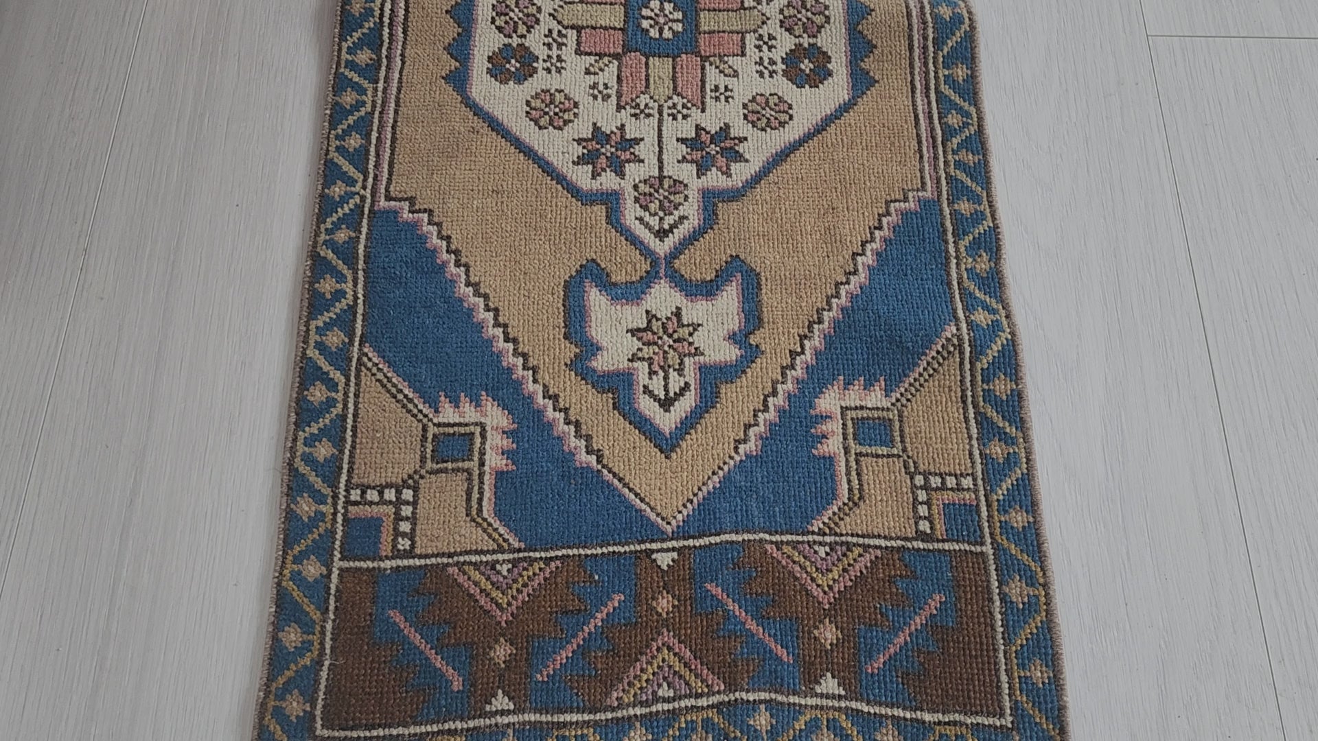 A lovely, hand-knotted small mat, this piece probably began its' life as a floor / sleeping pillow or storage bag for everyday use in village homes or in tents on nomadic travels. This mat was originally woven in Central Anatolia, Turkey up to 60 years ago and is perfect for use in entry ways, in front of the sink in the kitchen or beside a bed etc. Softly colored, This particular rug is an Oushak Style / Pastel Wash Vintage Turkish Rug which has been “Color Reformed” and / or "Antique Washed" and the pile reduced to produce the faded / distressed “Vintage-Look” so popular at this time. These rugs combine a contemporary color palette with vintage design appeal