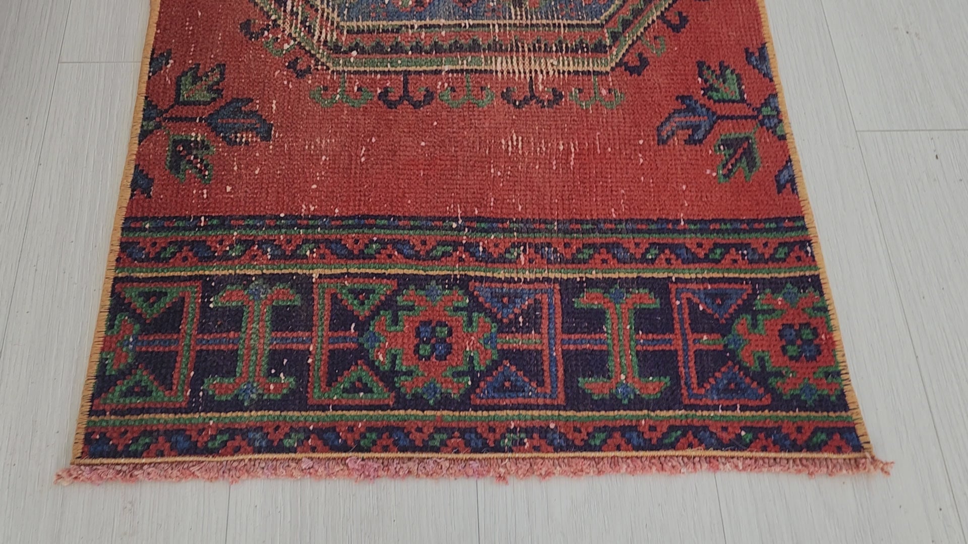 Small Turkish Rug, 4 ft 1 in x 1 ft 8 in, Apricot Orange and Teal Green / Grey Vintage Faded Distressed Door Mat