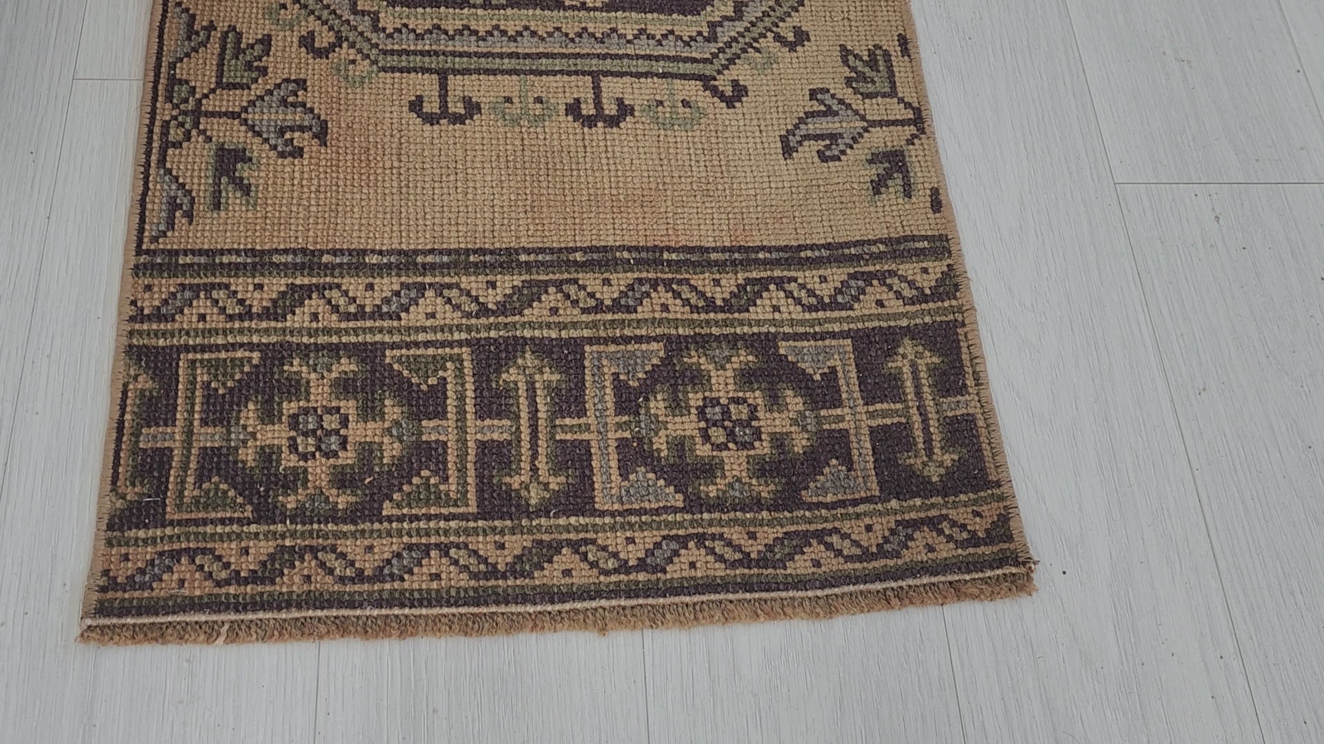 Small Turkish Rug, 4 ft 2 in x 1 ft 9 in, Apricot Orange and Teal Green Vintage Faded Distressed Door Mat