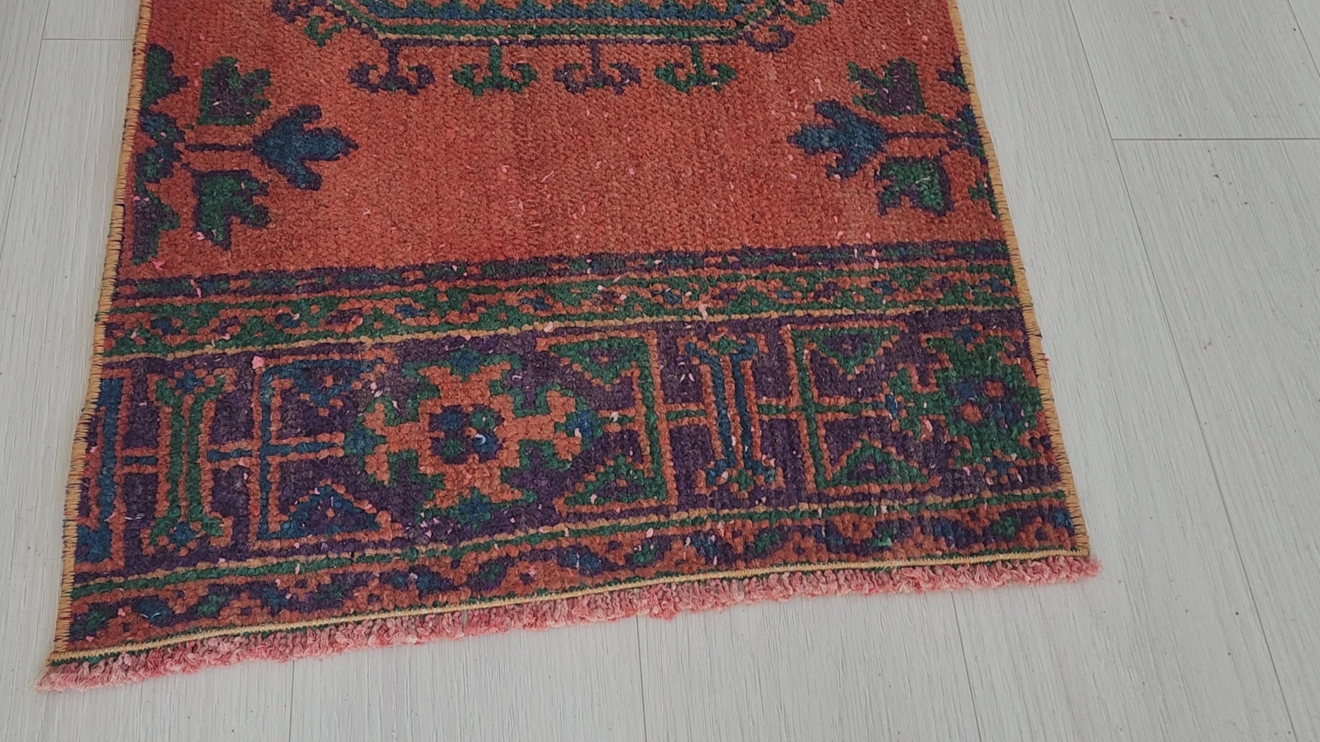 Small Turkish Rug, 4 ft 3 in x 2 ft, Apricot Orange and Teal Green Vintage Faded Distressed Door Mat