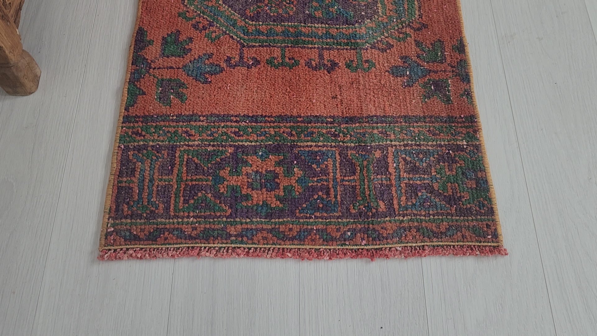 Small Turkish Rug, 4 ft 4 in x 2 ft, Apricot Orange and Teal Green Vintage Faded Distressed Door Mat
