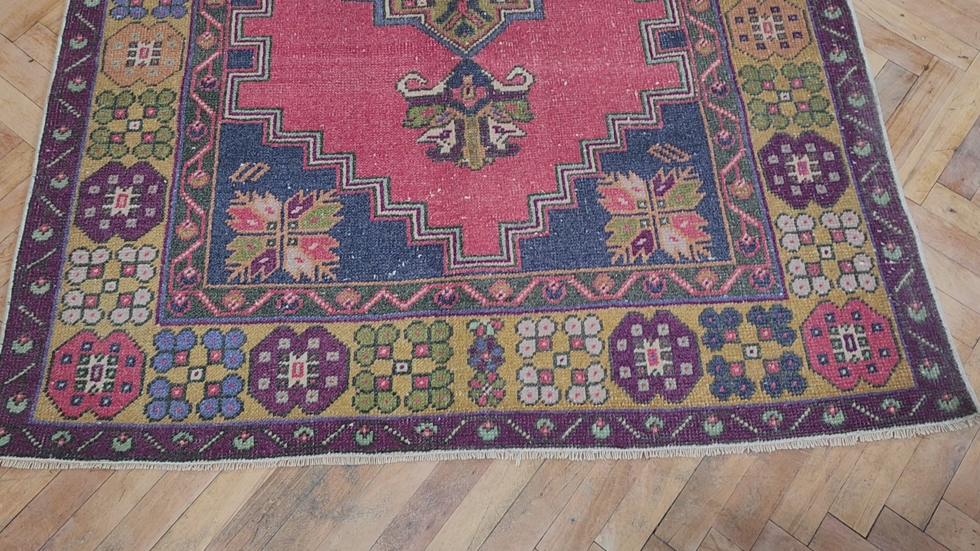 Turkish Oriental Rug 7 x 4 Red Blue Anatolian Tribal Medallion Carpet, Handmade Natural Wool Boho Rustic Taspinar Tribal Cappadocia Rug
