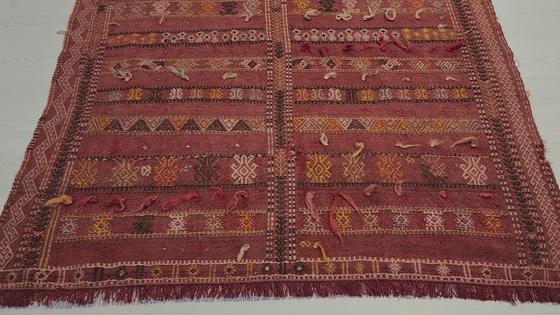 Handmade, Vintage Wool, Flat-Weave Cicim Kilim Rug, woven in the Konya region of Central Anatolia, Turkey by Tribal Weavers up to 60 years ago. Cicim Kilims are often referred to as "embroidered" weavings as the design motifs are applied "in addition to" the warp and weft (supplementary weft technique) adding a textured effect to the plain background. This kilim is Turkish Sheep Wool on Goat Hair foundation.