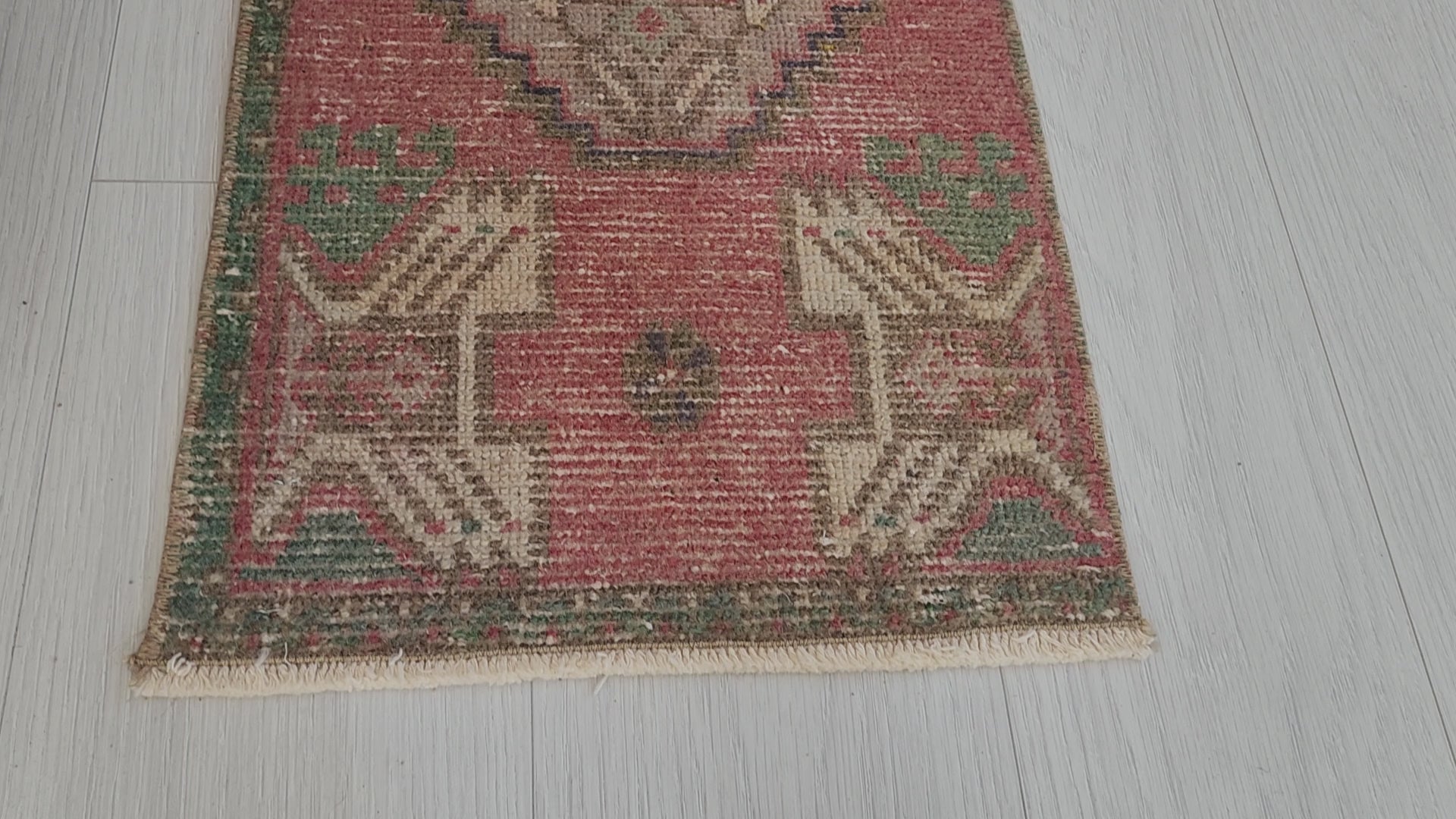 This is a small Pink and Grey Vintage Turkish Rug measuring 2' 9" x 1' 3" (83.8 cms x 38.1 cms). A lovely, hand-knotted small mat, this piece probably began its' life as a floor / sleeping pillow or storage bag for everyday use in village homes or in tents on nomadic travels. This mat was traditionally woven using locally sourced sheep wool in Central Anatolia, Turkey up to 60 years ago. Originally very strongly colored, this rug has been been “color reformed” / “sun faded” and / or “overdyed” and the pile reduced to produce the muted / distressed “Vintage" appearance so popular for interior home decoration at this time. This Small Mat is perfect for use in entry ways, in front of the sink in the kitchen or beside a bed etc.