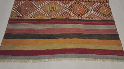 Orrange Red and Green Turkish Kilim Rug measuring 4' 6 " x 5' 6" (166 cms x 137 cms). Originally servicing the family of the weaver as a Bestik (baby cradle) this is a Handmade, Vintage Wool, Flat-Weave Cicim Kilim Rug, woven in Far South Eastern Anatolia,Turkey by Tribal Weavers up to 60 years ago. Cicim Kilims are often referred to as "embroidered" weavings as the design motifs are applied "in addition to" the warp and weft (supplementary weft technique) adding a textured effect to the plain background. Cicim Rugs are "single sided" due to the embroidery on the top surface.