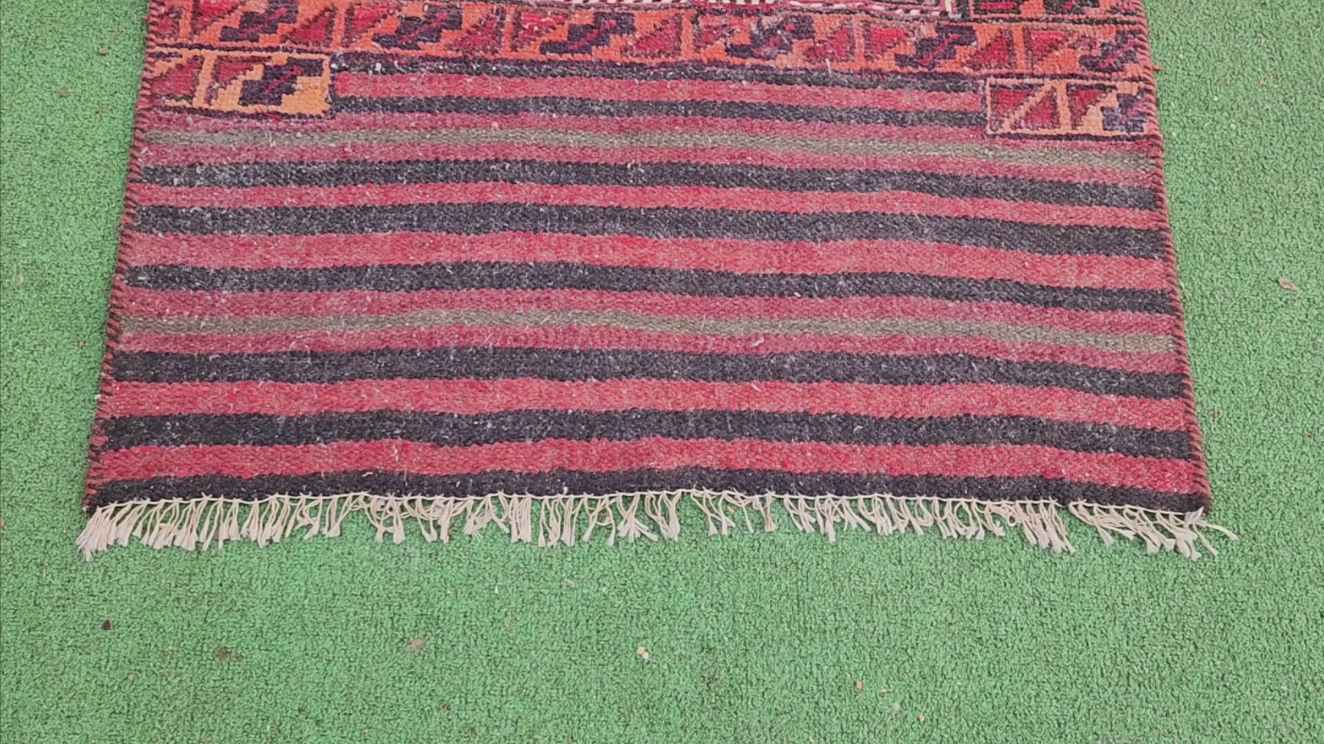 erracotta and Black Turkish Kilim Rug measuring 5'5'' x 2'3" (167 cms x 70 cms). Originally servicing the family of the weaver as a Bestik (baby cradle) this is a Handmade, Vintage Wool, Flat-Weave Cicim Kilim Rug, woven in Far South Eastern Anatolia,Turkey by Tribal Weavers up to 60 years ago. Cicim Kilims are often referred to as "embroidered" weavings as the design motifs are applied "in addition to" the warp and weft (supplementary weft technique) adding a textured effect to the plain background. Cicim Rugs are "single sided" due to the embroidery on the top surface.